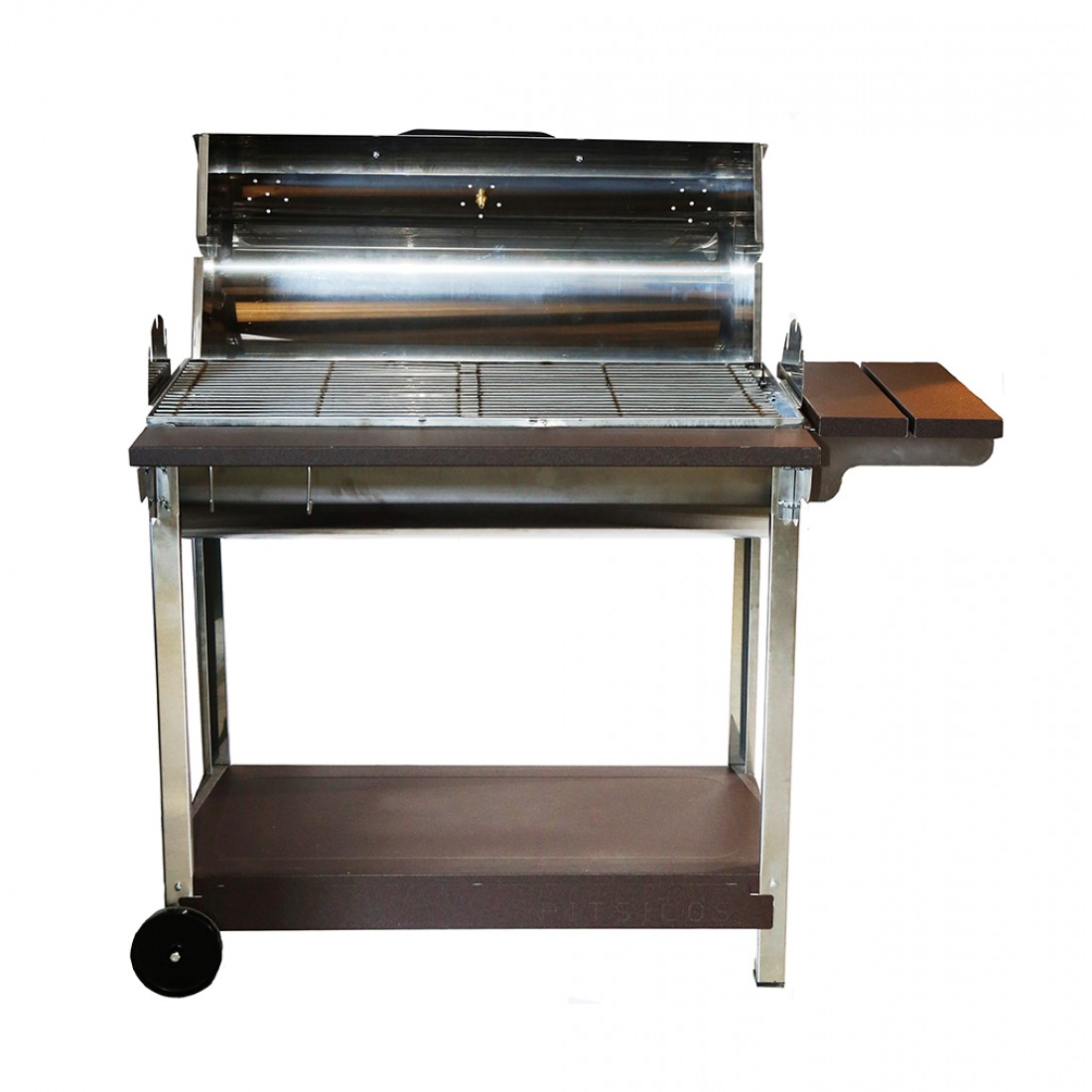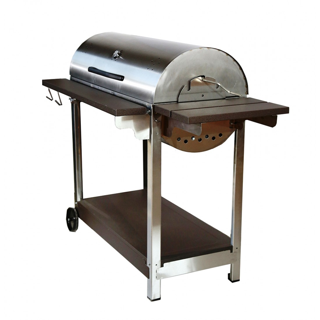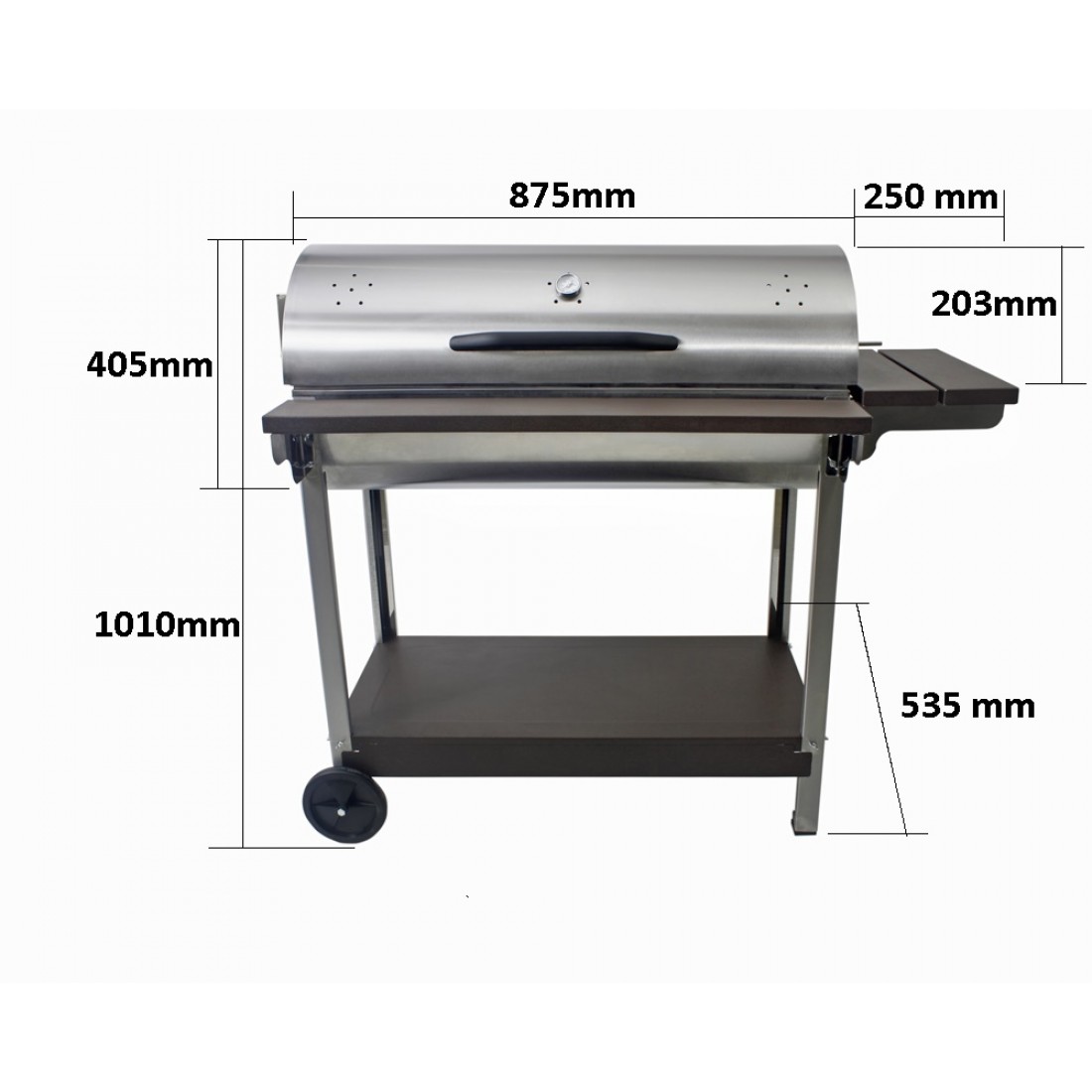 Ανοξείδωτη ψησταριά κάρβουνου τύπου βαρελάκι. Κομψός σχεδιασμός Ποιότητα κατασκευής Θερμόμετρο στο καπάκι Ρόδες μεταφοράς 3 χρήσιμα ράφια χρώματος βέγγε (σφυρήλατο) Ανοξείδωτες σχάρες ψησίματος Δυνατότητα τοποθέτησης σούβλας και μοτέρ Προστατευτικό κυάθιο στο χώρο καύσης (αφαιρείται πανεύκολα μετά τη χρήση για να αδειάσετε τη στάχτη) ΤΟ ΚΑΠΑΚΙ ΕΧΕΙ ΣΗΜΑΣΙΑ ! Προτείνουμε να έχετε το καπάκι κλειστό κατά τη διάρκεια του ψησίματος. Με αυτόν τον τρόπο τα ψητά σας θα διατηρήσουν τους ζωμούς τους και θα ψηθούν σε λιγότερο χρόνο. Παράλληλα οι απώλειες θερμότητας θα είναι μικρότερες με αποτέλεσμα να έχετε μικρότερη κατανάλωση σε κάρβουνο. Επιπλέον με κλειστό καπάκι ο ζεστός αέρας που κυκλοφορεί στο εσωτερικό της ψησταριάς κάνει πιο έντονη τη χαρακτηριστική μυρωδιά του ψητού στο κάρβουνο που όλοι αγαπάμε στο φαγητό.